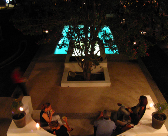 junto al fuego, su sombreada pérgola, la sala de cartas y la